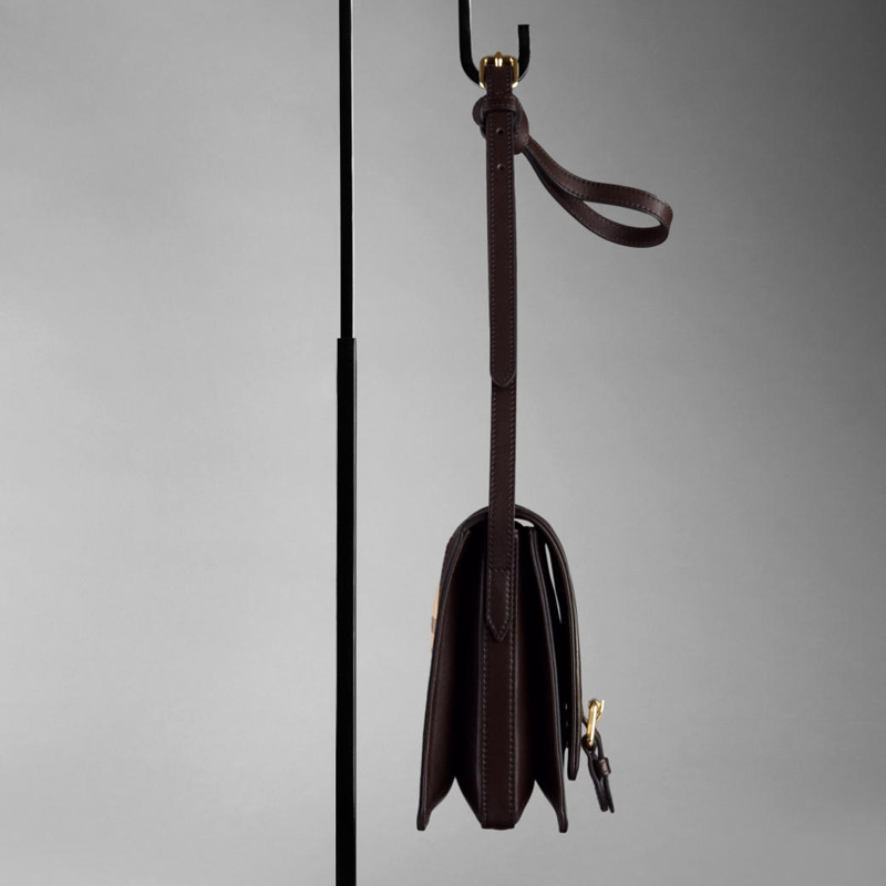- Fine adjustable leather shoulder strap, belted flap and snap button closure