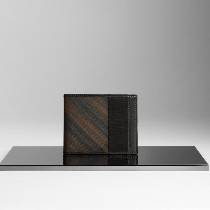 - Smoked check coated canvas folding wallet- Smooth leather trim- Note and card slots- 100% PVC with leather trim