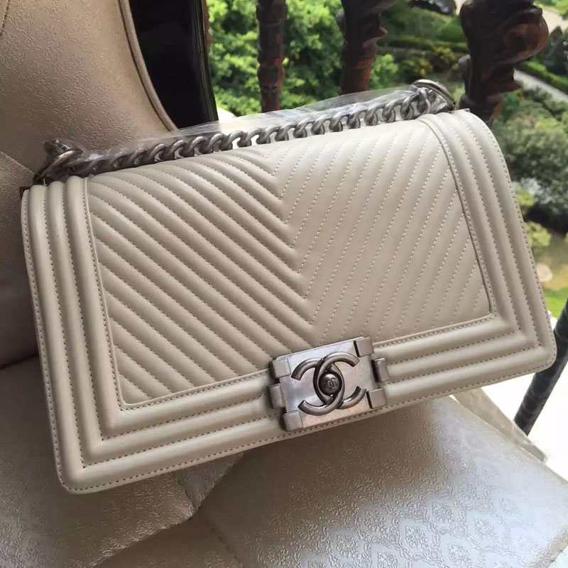 2015 Boy Chanel Flap Shoulder Bag Herringbone Stitching A92493 Offwhite