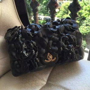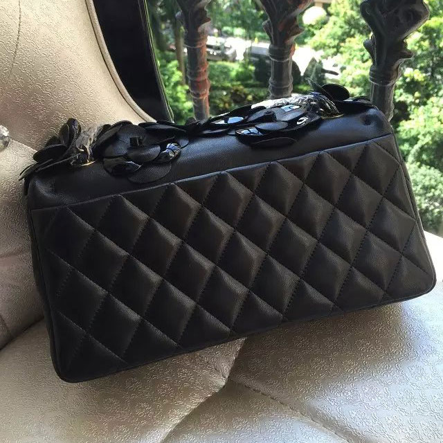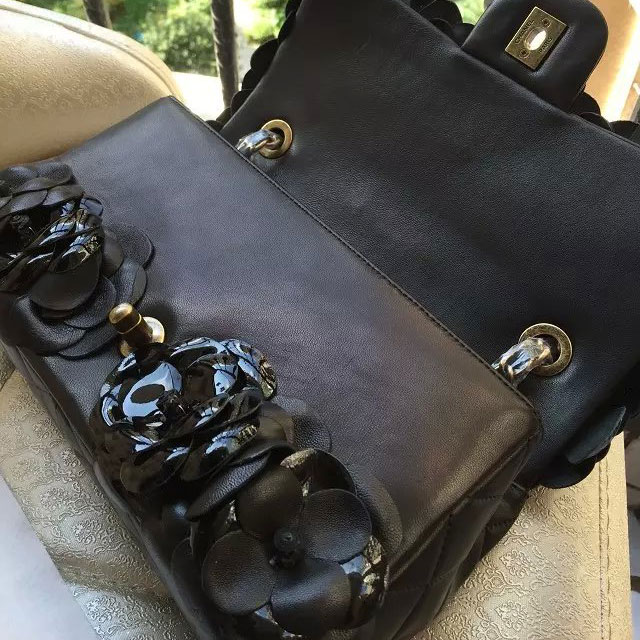 2015 Chanel Camellia Flap Bag Original Sheepskin Leather A92787 Black