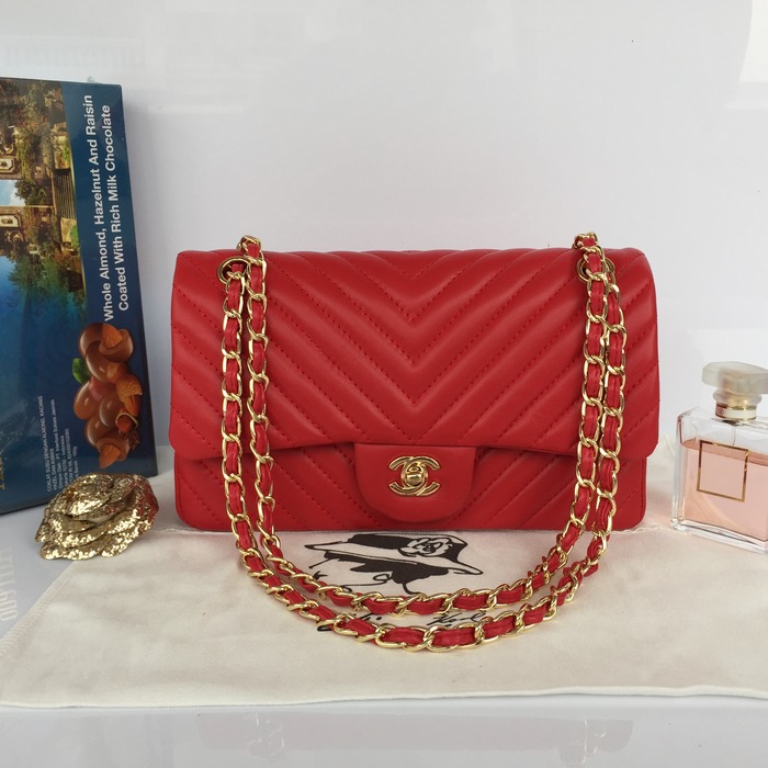2015 Chanel Lambskin Chevron Quilting Classic Flap Bag 1112 Red