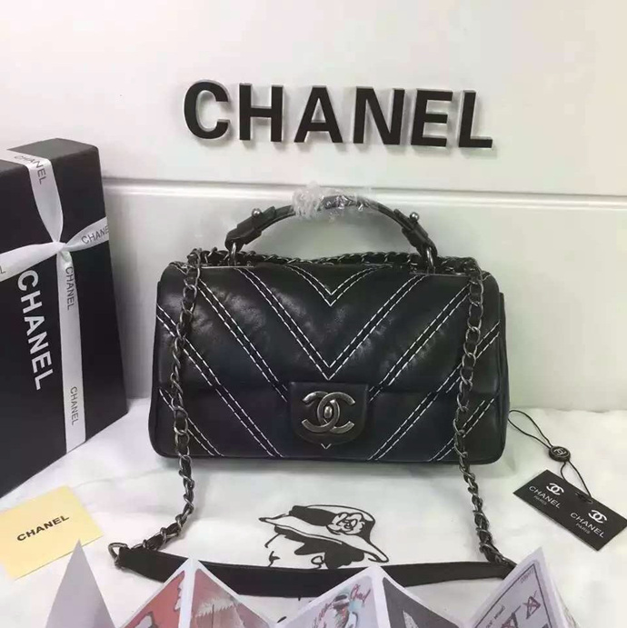 2016 Chanel Classic Top Handle Bag Original Chevron Calfskin Leather A94168 Black