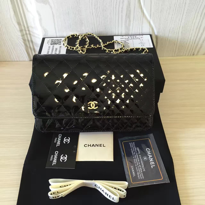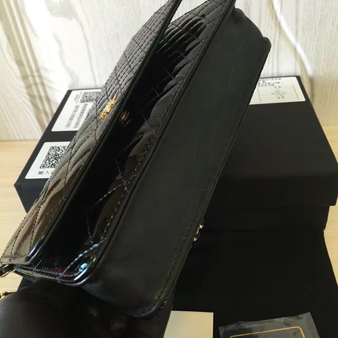 2016 Chanel WOC A33814 Black Original Patent Leather Mini Flap Bag Gold
