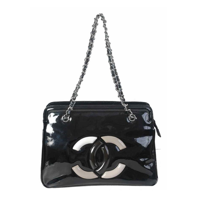 - Small lipstick patent calfskin shopper with a large CHANEL embedded signature and leather-interlaced chain.
