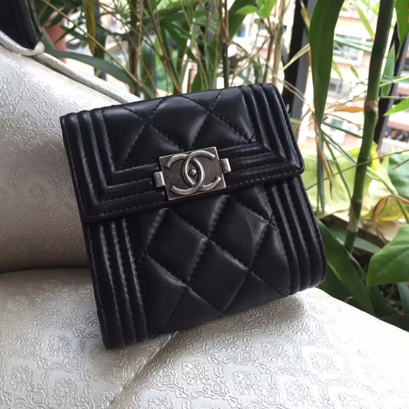 Boy Chanel Matelasse Tri-Fold Wallet Original Sheepskin Leather A80107 Black
