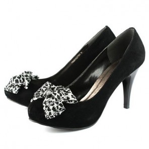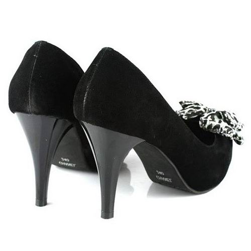 - Crescent-toe, self-covered heel, leather lining, black suede, bowknot design on the vamp