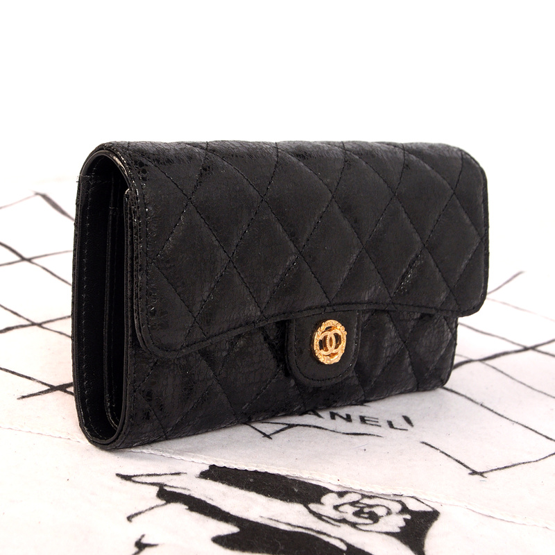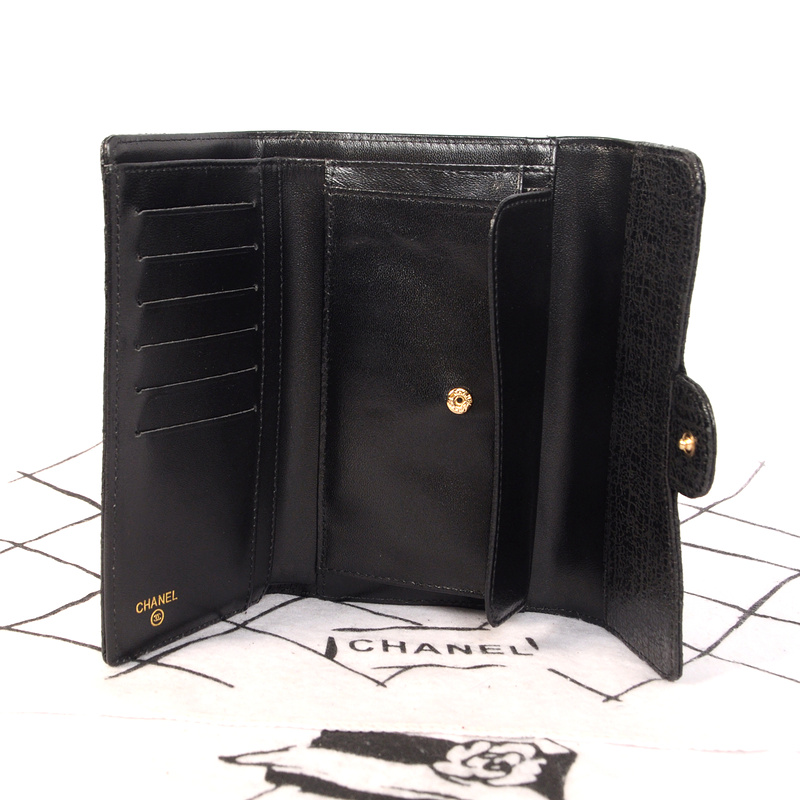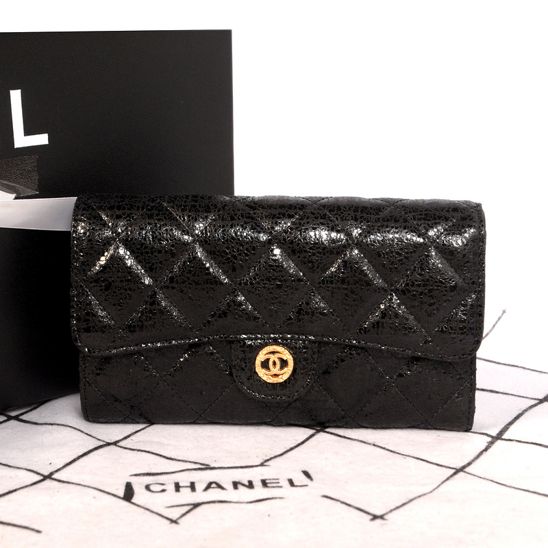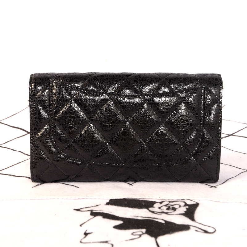 Chanel C006 Black Glazed Crackled Leater Long Tri-Fold Wallet