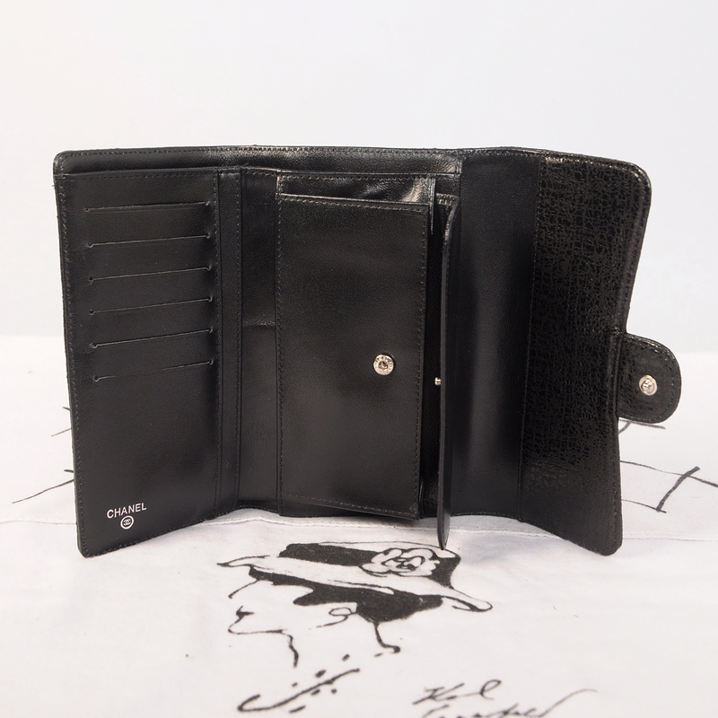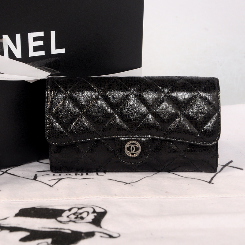 Chanel C006 Black Glazed Crackled Leater Long Tri-Fold Wallet with Silver