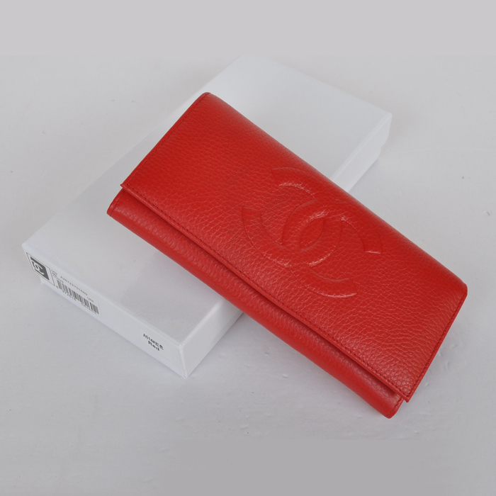 Chanel Emboss CC Logo Litchi stripes leather Bi-Fold Wallet C514 Red