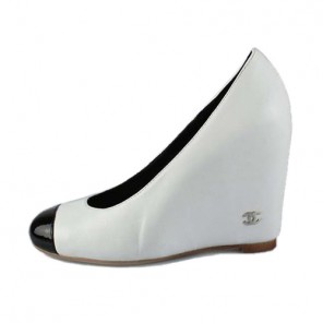 - Round toe, white leather body and black cap-toe, CC logo decorated on the side of the wedge heel, leather lining and rubber sole
