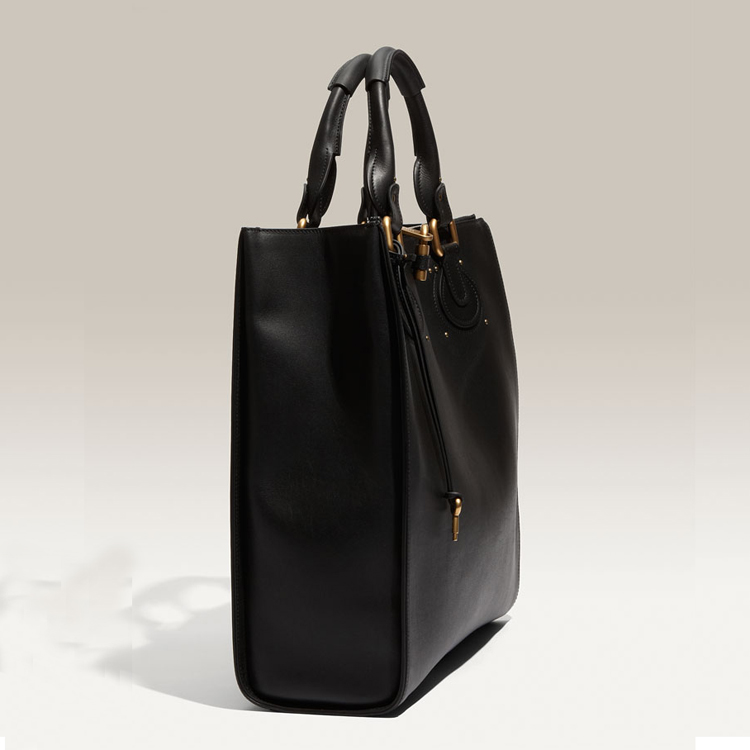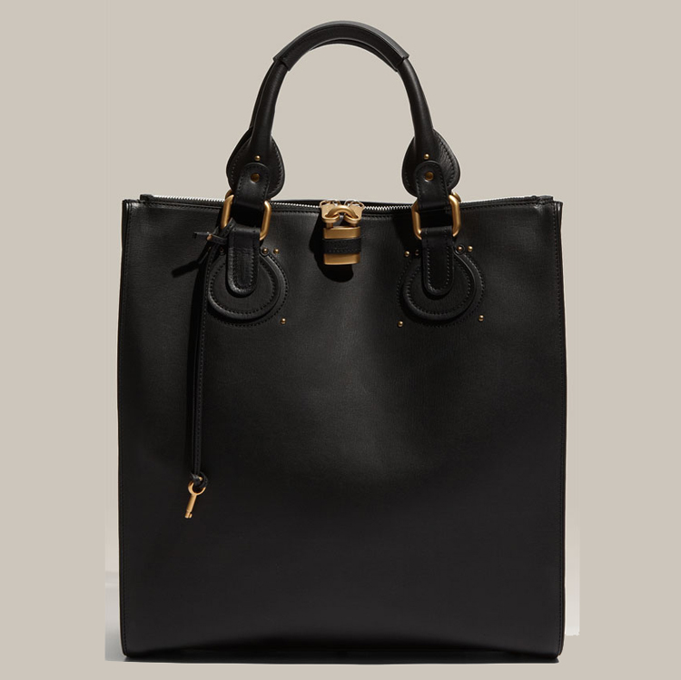 Substantial signature padlock hangs from the two-way top zip closure of a double-handled tote cut from smooth, supple leather.