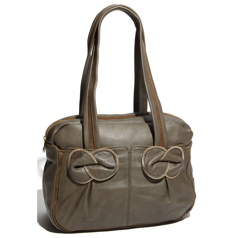 Infinity-knot embellishments modernized by zipper trim adorn a supple leather shoulder bag with sueded stripe detailing and logo-engraved hardware.