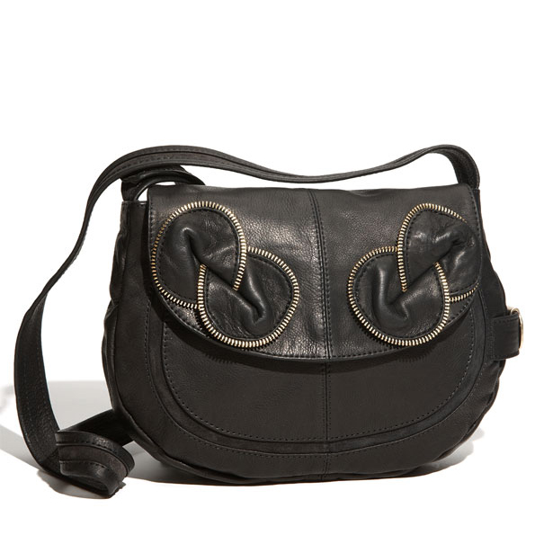 Infinity-knot embellishments modernized by zipper trim adorn a supple leather crossbody bag with sueded stripe detailing and logo-engraved hardware.