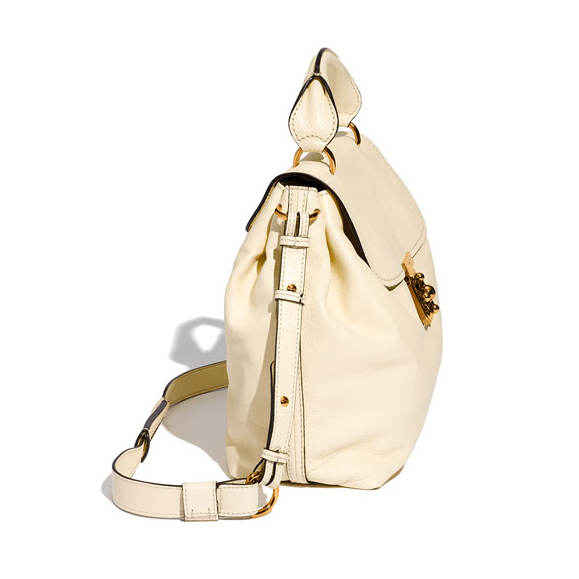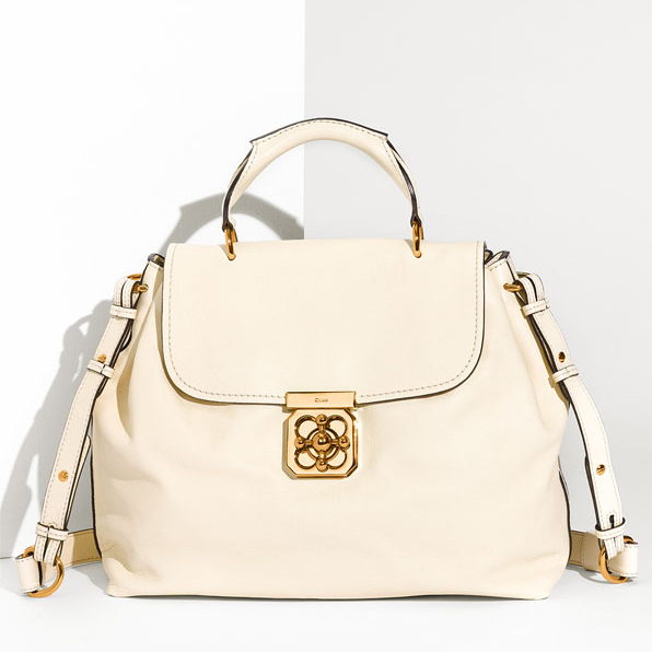 Geometric goldtone hardware fronts a sophisticated satchel cut from soft calfskin leather, while an adjustable shoulder strap provides a custom fit.