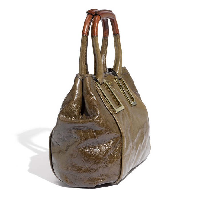 Crackled, glazed leather distinguishes a slouchy tote detailed with sophisticated goldtone hardware and topped with double rolled handles.