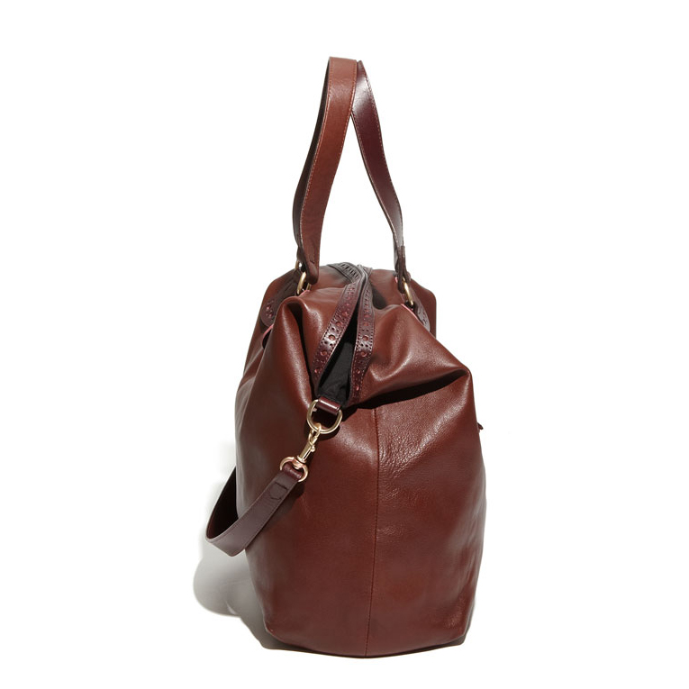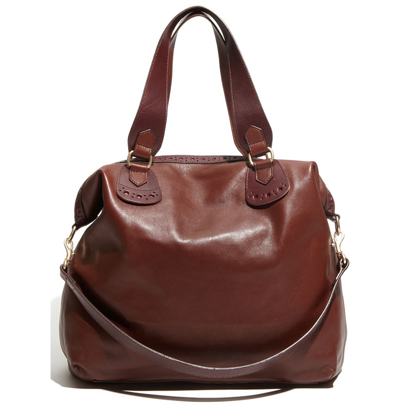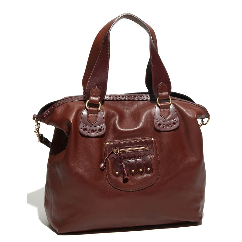 Cutout dots stencil a proper leather tote that sports oversized, riveted fringe and a tassel-trimmed zipper. An optional strap provides a convenient carrying option.