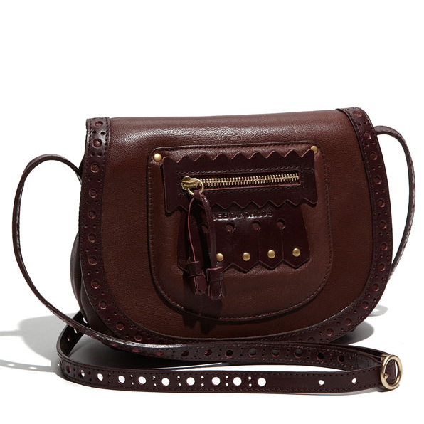 Cutout dots trim the flap edge and adjustable crossbody strap of a proper little bag that sports oversized, riveted fringe and a tassel-trimmed zipper.