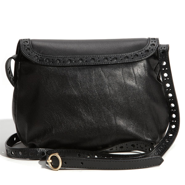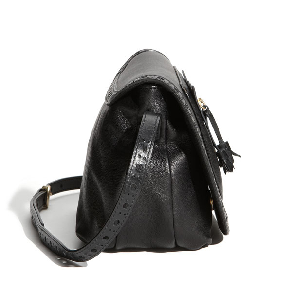 Cutout dots trim the flap edge and adjustable crossbody strap of a proper little bag that sports oversized, riveted fringe and a tassel-trimmed zipper.