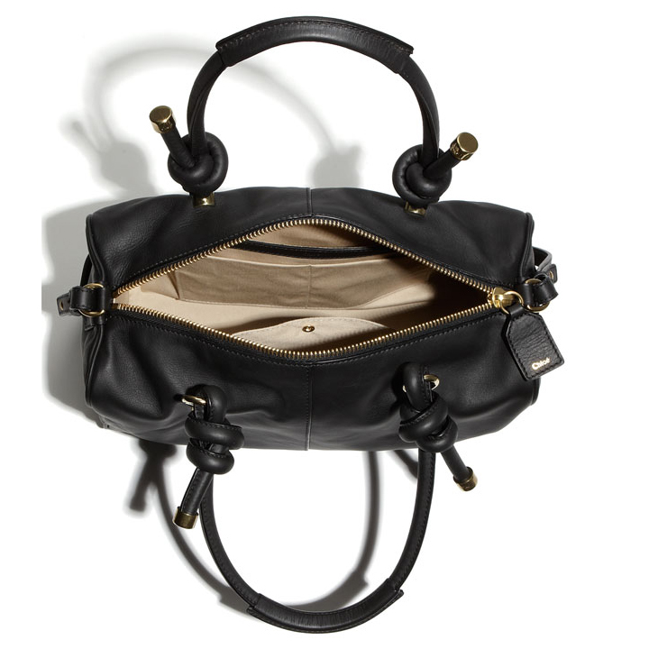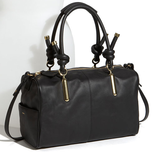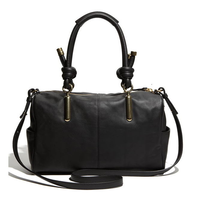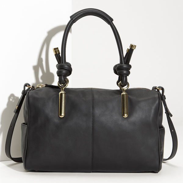 Double-wrapped knots secure the rolled handles atop a sumptuous leather satchel furnished with a convenient shoulder strap.