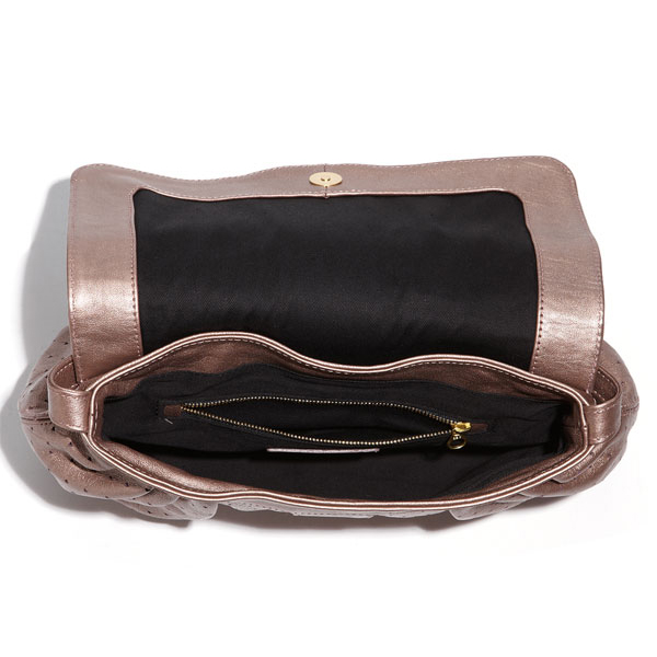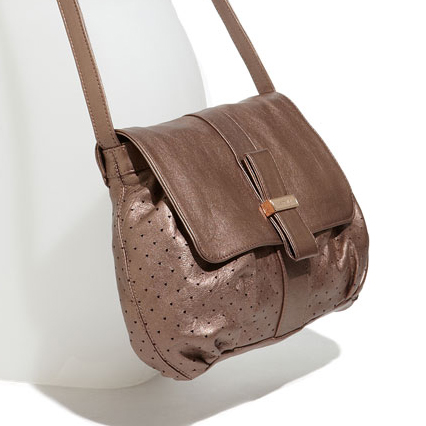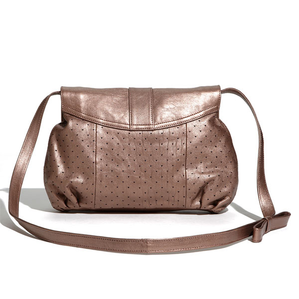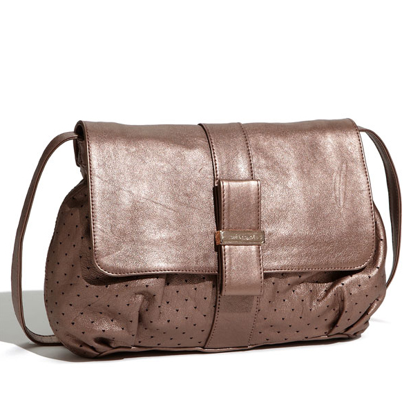 A luster-finished bag takes a tender turn with a sweetly gathered silhouette perforated by tiny heart cutouts. A bow-detailed flap is accented by a rose-toned logo plaque, while another bow tops a comfy crossbody strap.