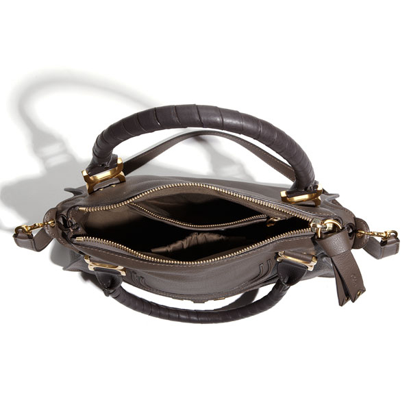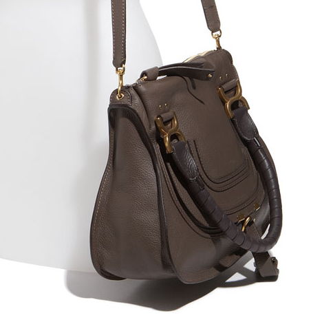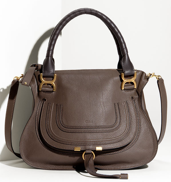 Textured, curvy flap鈥攂randed by subtle embossing鈥攕ecures the front pocket of a sophisticated satchel crafted from lightly pebbled calfskin and topped with wrapped handles and an optional strap.