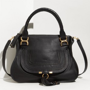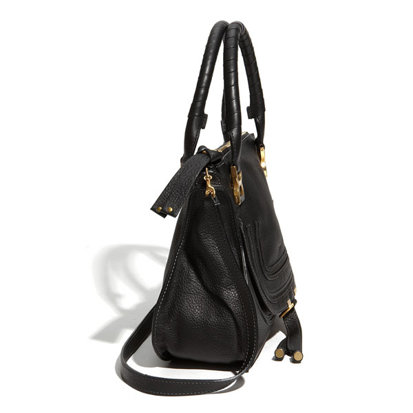 Textured, curvy flap鈥攂randed by subtle embossing鈥攕ecures the front pocket of a sophisticated satchel crafted from lightly pebbled calfskin and topped with wrapped handles and an optional strap.