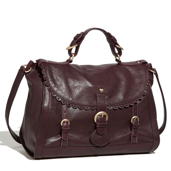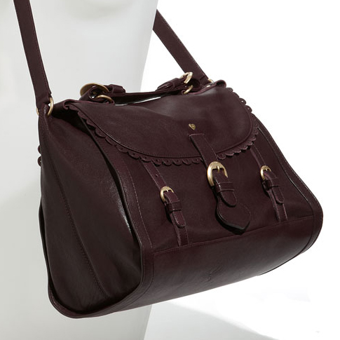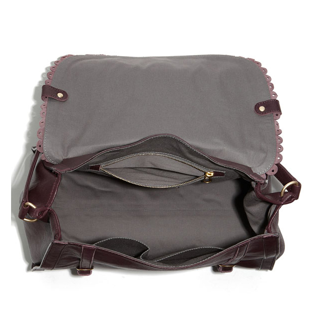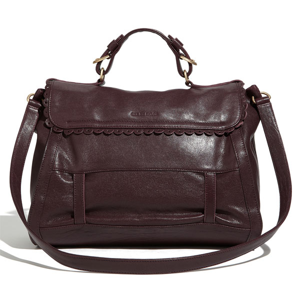 A scalloped trim stenciled with circle cutouts details the curved flap on a lustrous leather satchel. Burnished logo-etched buckles secure the top handle, while a thin crossbody strap completes a delightfully vintage look.
