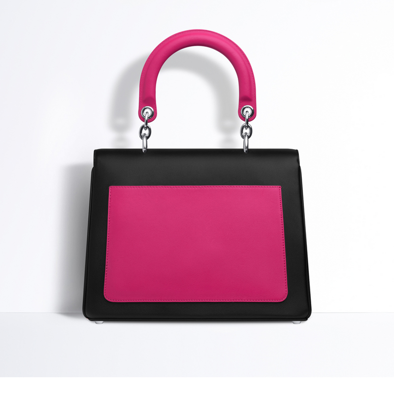 This small bag features a daring two-tone effect with its smooth black calfskin and its Fuchsia handle and details.