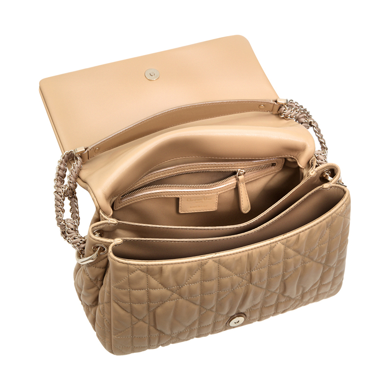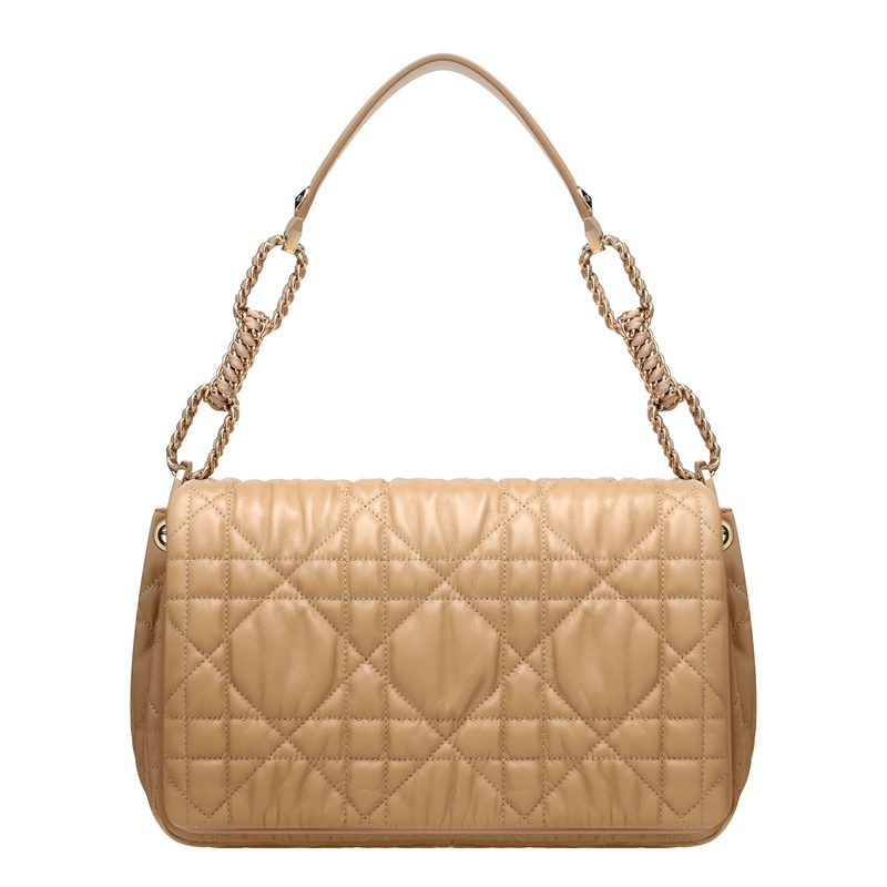 - This beige lambskin flap bag with embossed 'Cannage' stitching has a press closure.