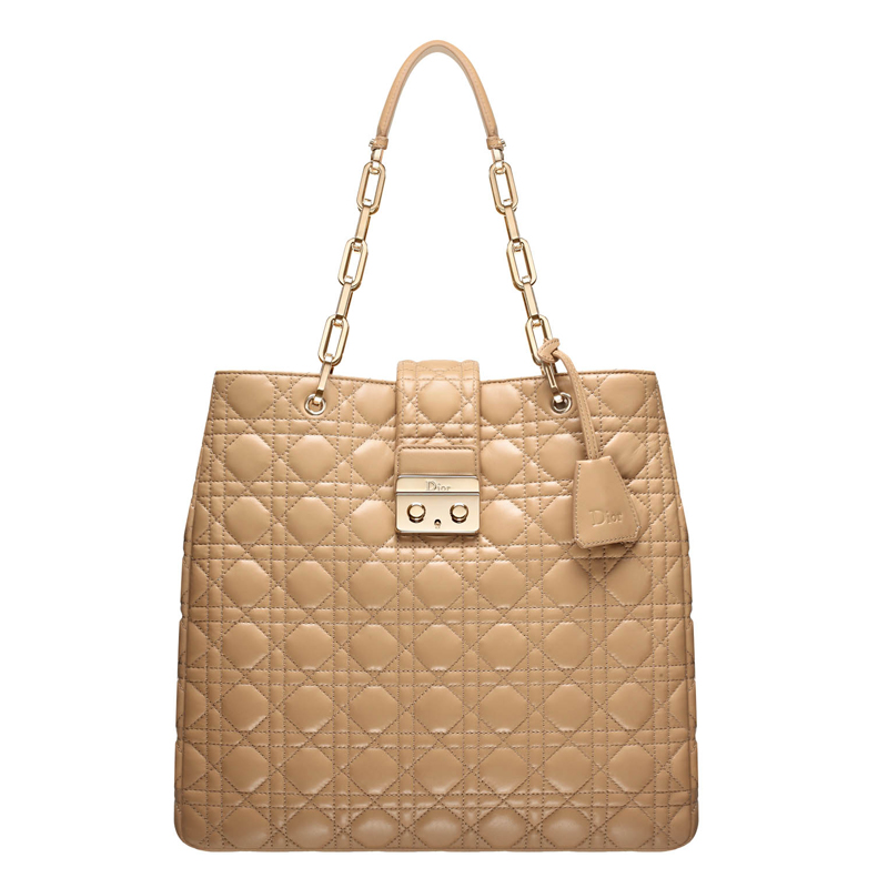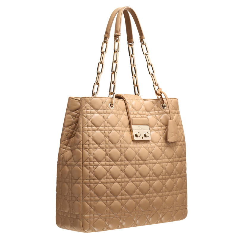 - This practical and elegant Dior Beige lambskin bag is crafted with the 'Cannage' stitching emblematic of Dior. Its pale-gold metal handle allows it to be carried on the shoulder.