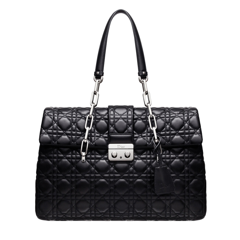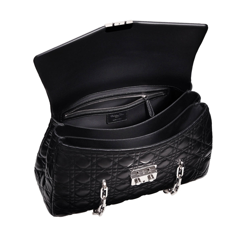 - This practical and elegant black lambskin bag is crafted with the 'Cannage' stitching emblematic of Dior. Its silver-tone metal handle allows it to be carried on the shoulder.