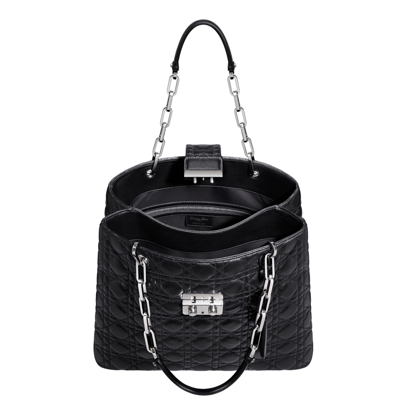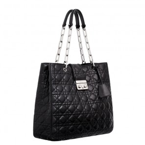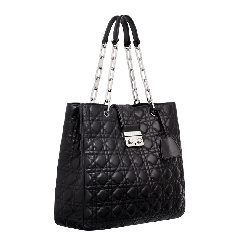- This practical, elegant large black lambskin bag is crafted with 'Cannage' stitching emblematic of Dior. Its silver-tone metal handle allows it to be carried on the shoulder.
