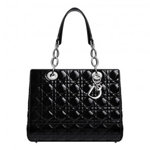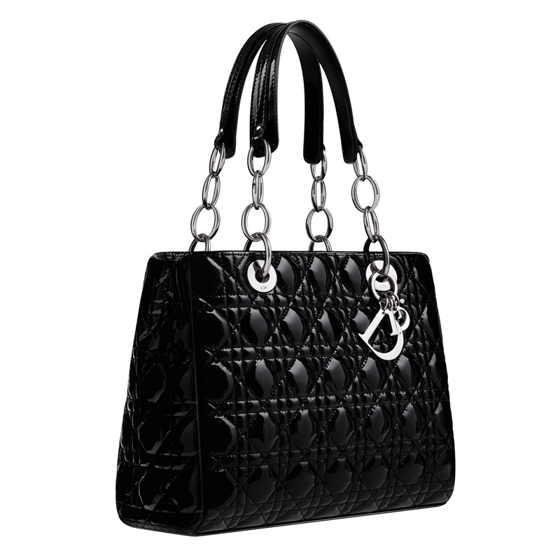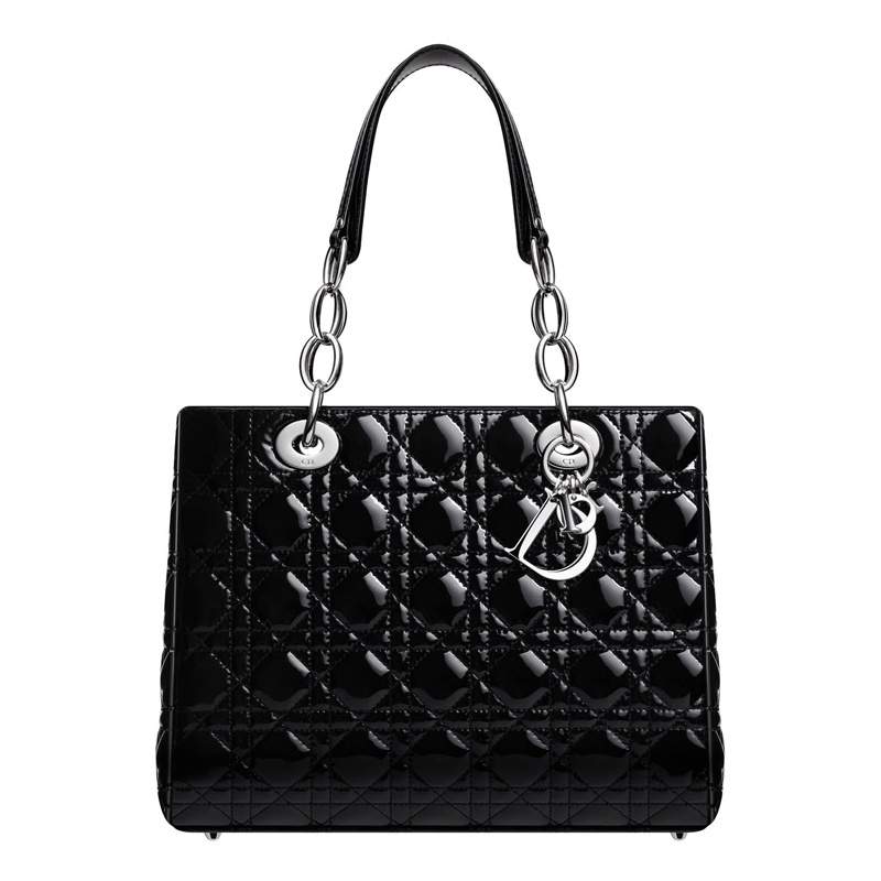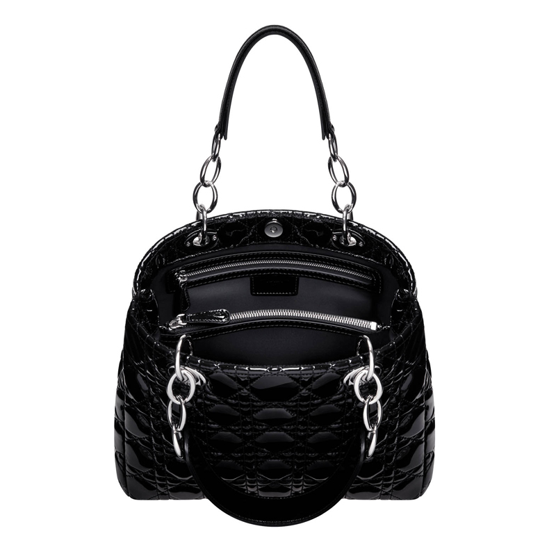 - This bag in black patent quilted lambskin is adorned with 'Cannage' stitching.