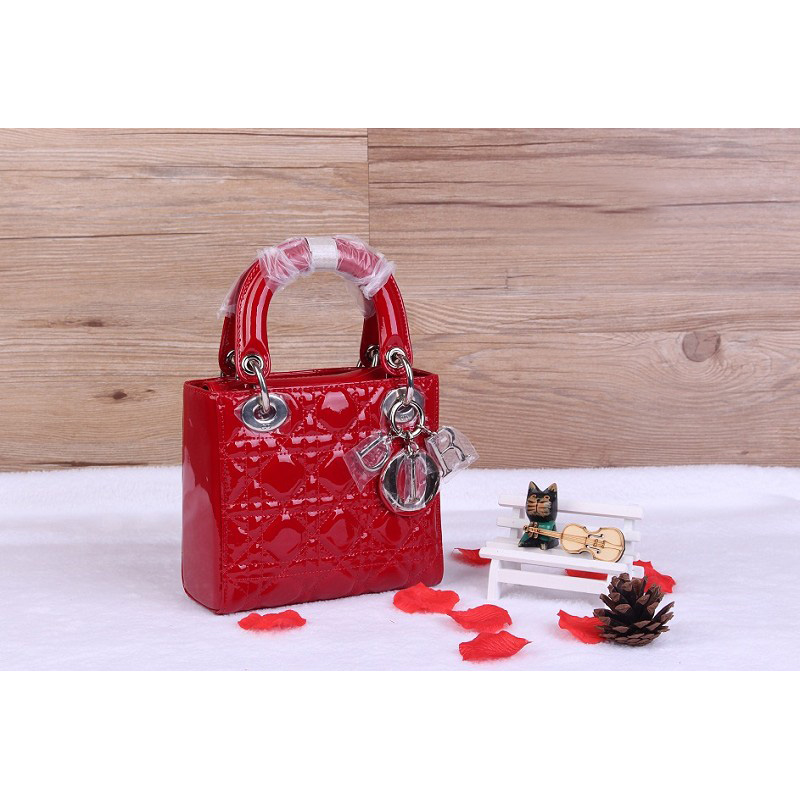Christian Lady Dior Bag Patent Leather D1633 Red with Silver