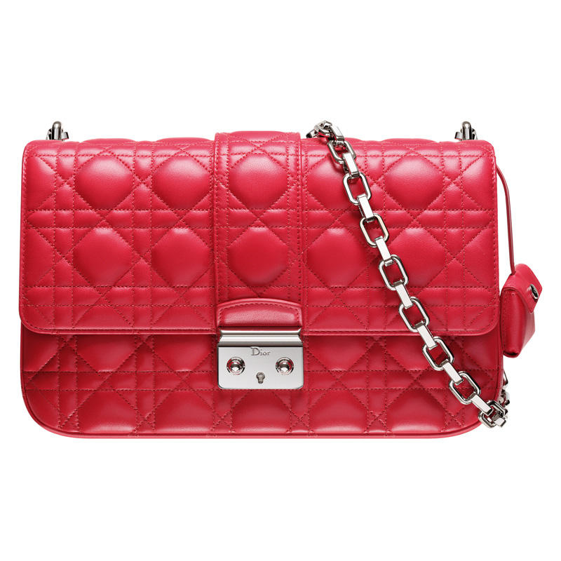 In crimson red lambskin, this bag is accessorised with a silver-tone metal chain allowing it to be carried on the shoulder. A key in its own leather case opens the double-push-button clasp