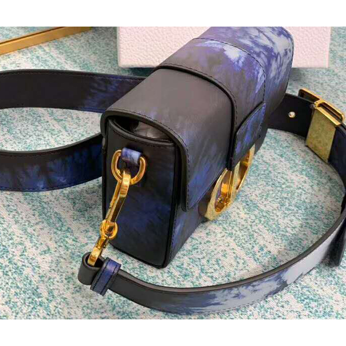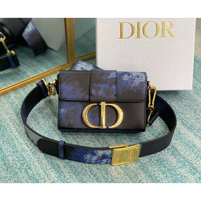 The 30 Montaigne line, inspired by the historic, emblematic address, presents essential pieces that portray the iconic codes of the House. This compact handbag is crafted in blue smooth printed calfskin with the Tie & Dior motif for an elegant and timeless look. The flap is embellished with an antique gold-finish metal 'CD' clasp, inspired by the seal of a Christian Dior perfume bottle. Refined details, such as an embossed '30 Montaigne' signature on the back and the military-inspired buckle, define this unique design.
