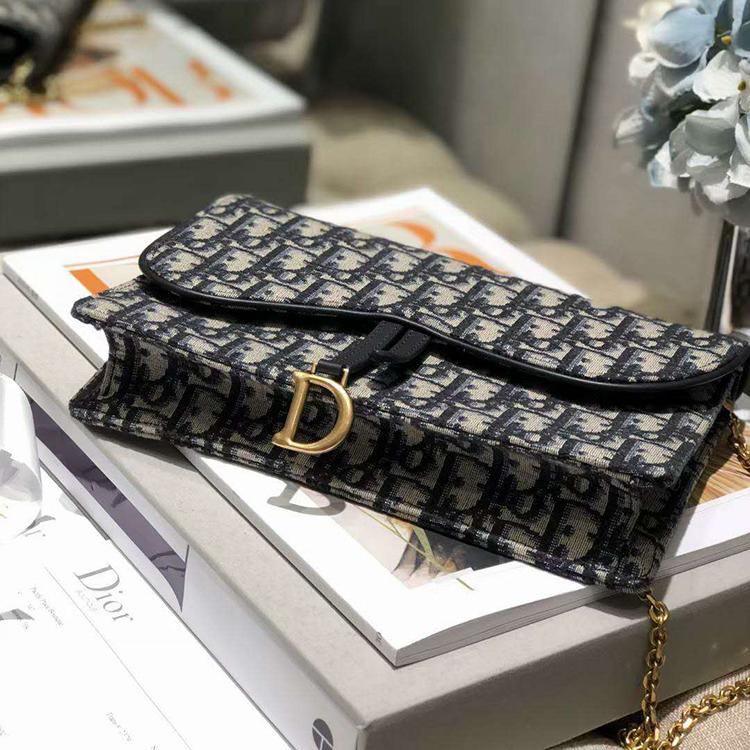 The Saddle pouch, crafted in blue Dior Oblique jacquard, presents a modern design. It pays tribute to the Saddle codes, with its asymmetrical flap and metallic 'D' stirrup magnetic clasp. Featuring a removable chain, the pouch opens on four card slots, a patch pocket and a zipped pocket. The day or evening style may be carried by hand, worn over the shoulder or crossbody.