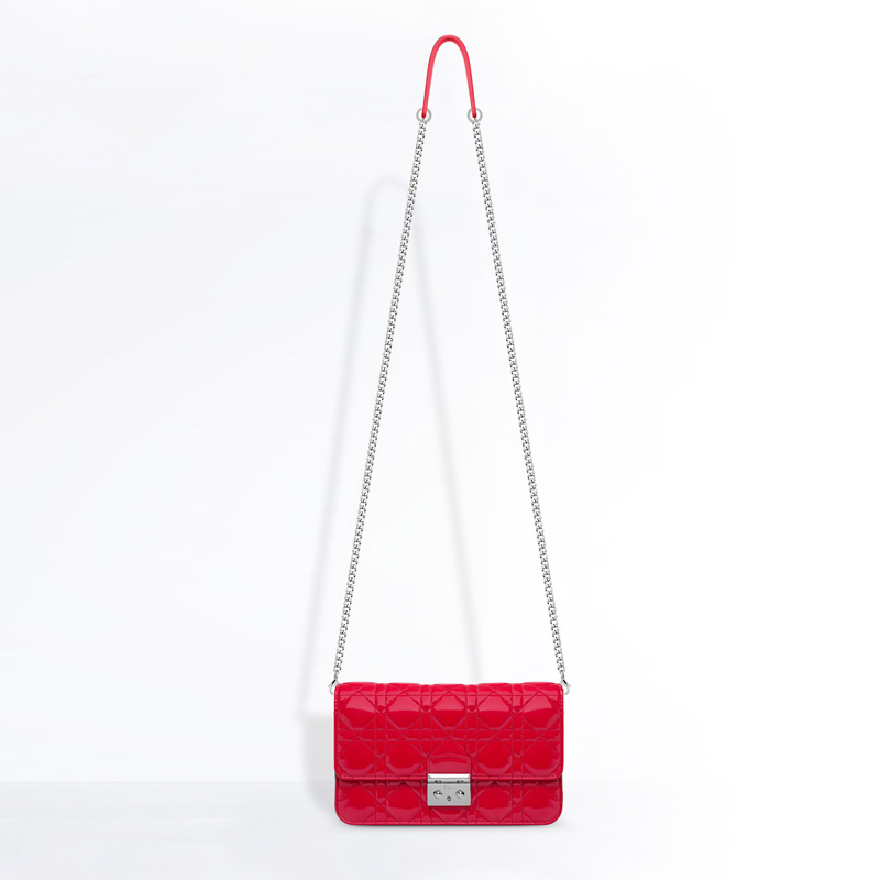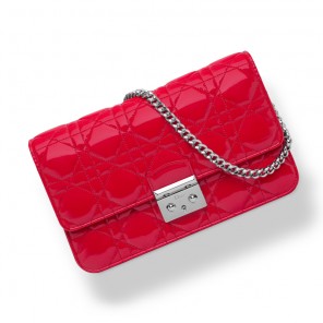 Decidedly feminine, the "Miss Dior" collection embodies all of Dior's modern style. This large "Promenade" pouch in iridescent red patent calfskin is adorned with a silver-tone clasp lending it elegance and practicality.
