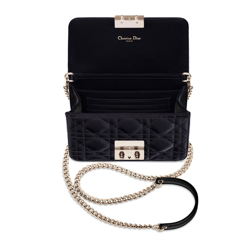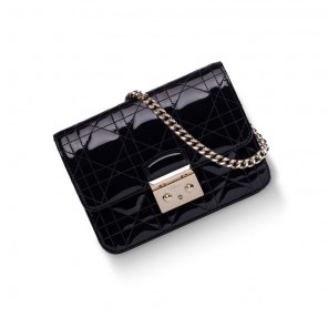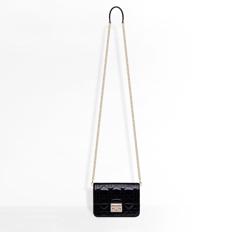 Decidedly feminine, the "Miss Dior" collection embodies all of Dior's modern style. This mini "Promenade" pouch in black patent calfskin features a light gold-tone clasp adding elegance and practicality.