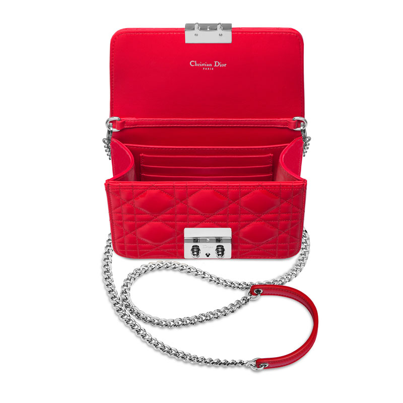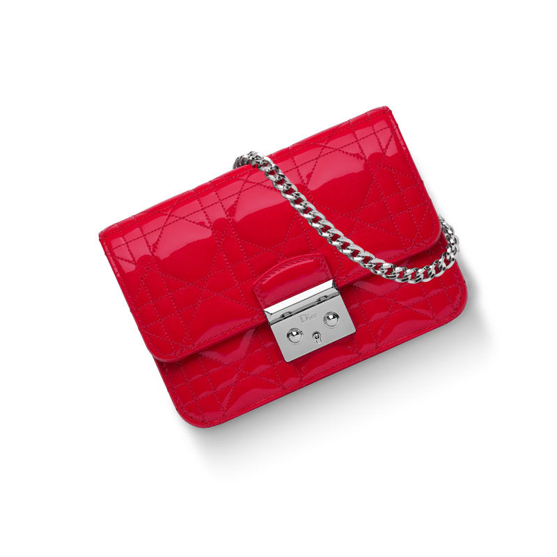 Decidedly feminine, the "Miss Dior" collection embodies all of Dior's modern style. This mini "Promenade" pouch in iridescent red patent calfskin is adorned with a silver-tone clasp lending it elegance and practicality.