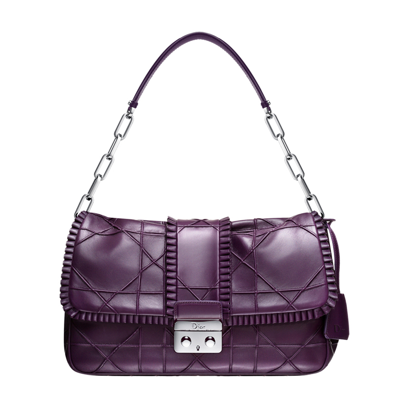 This range owes its name to the "New Look" devised by Christian Dior in 1947. This beige patent lambskin bag is distinguished by its embroidered ruffles, its Cannage stitching and its handle combining leather and a silver-tone metal chain. Its silver-tone clasp engraved with "Dior" adds a touch of originality.