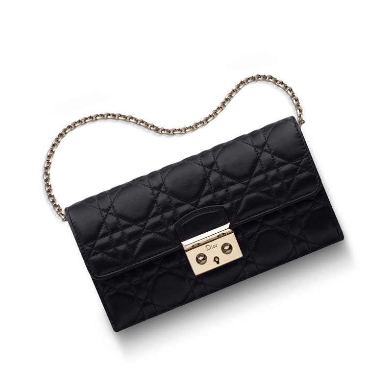 Decidedly feminine, the "Miss Dior" collection embodies all of Dior's modern style. The "Rendez-Vous" wallet in black lambskin features a light gold clasp adding elegance and practicality.