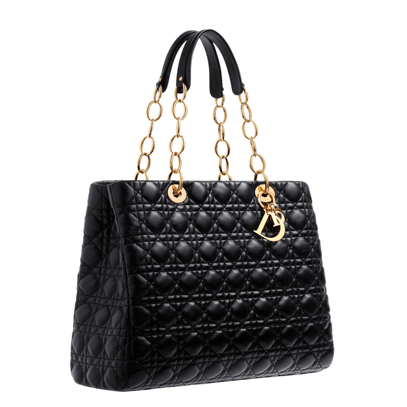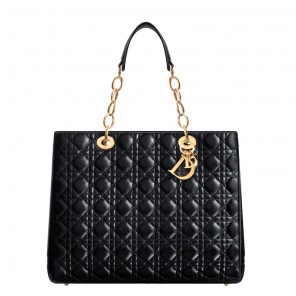The practical, elegant and comfortable "Dior Soft" collection is the epitome of Couture craftsmanship.This generous-sized shopping bag in black lambskin is adorned with Cannage stitching making the leather supple. Its two handles intertwining leather and gold-tone chains allow it to be worn on the shoulder.