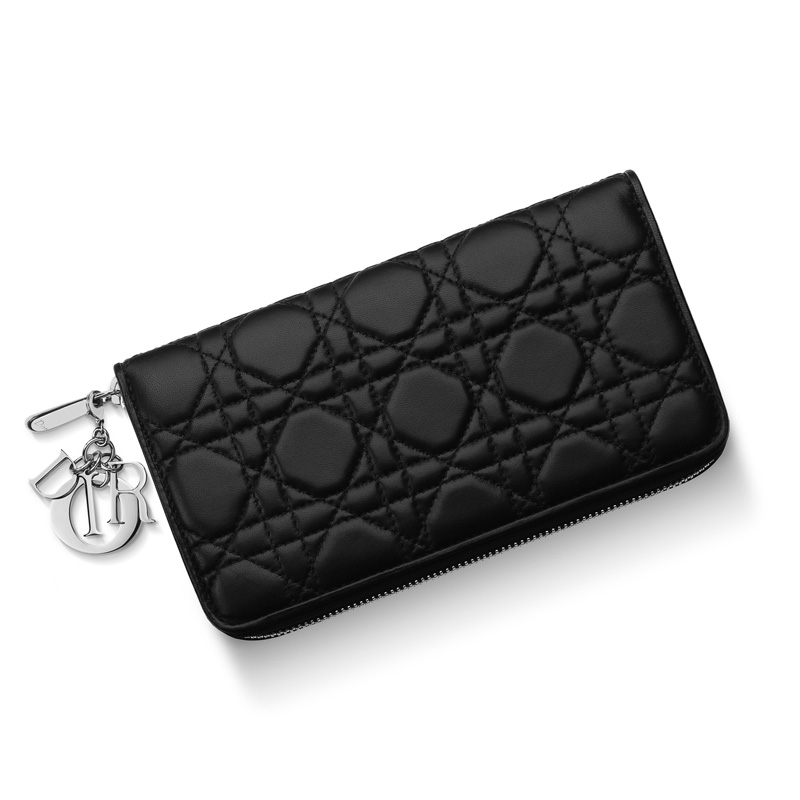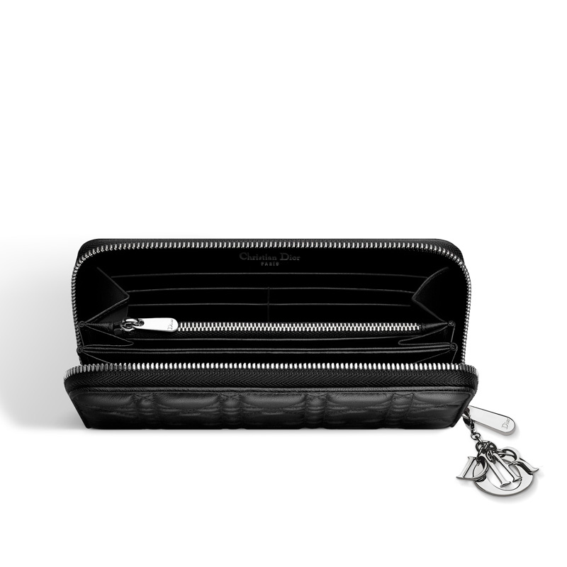 A timeless and unique work of art, the "Lady Dior" collection is imbued with the Couture spirit of Dior. The "Voyageur" wallet in black lambskin is enhanced by "Cannage" stitching and silver-tone charms. It is spacious and combines elegance with practicality.