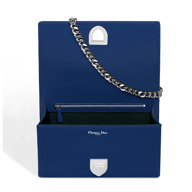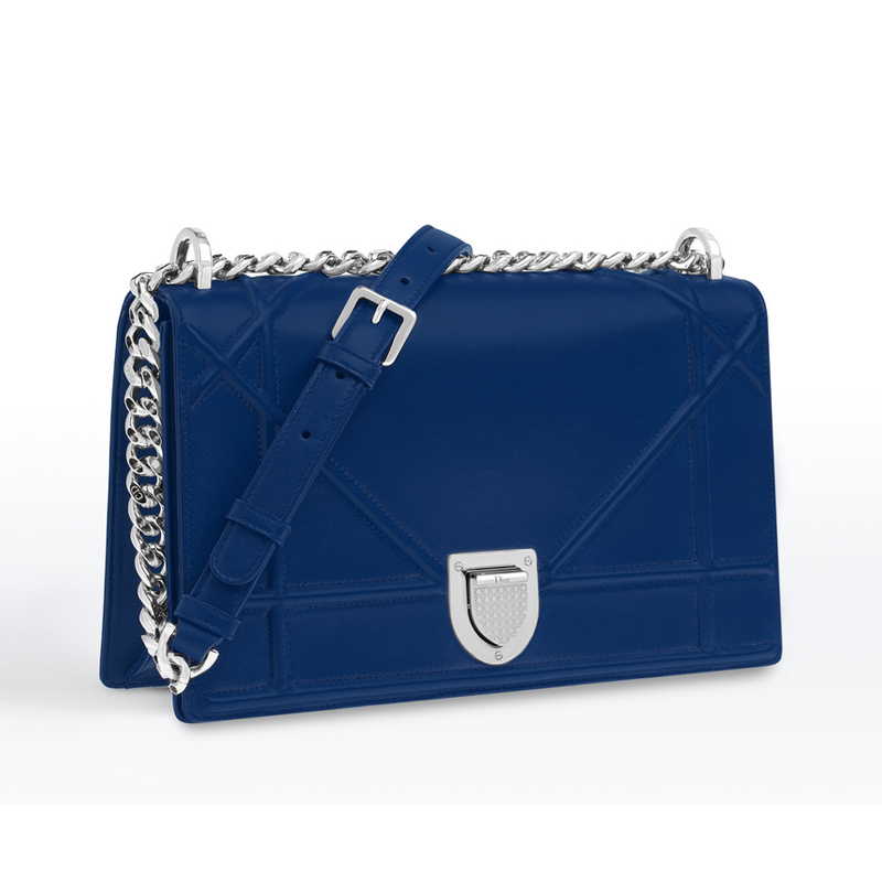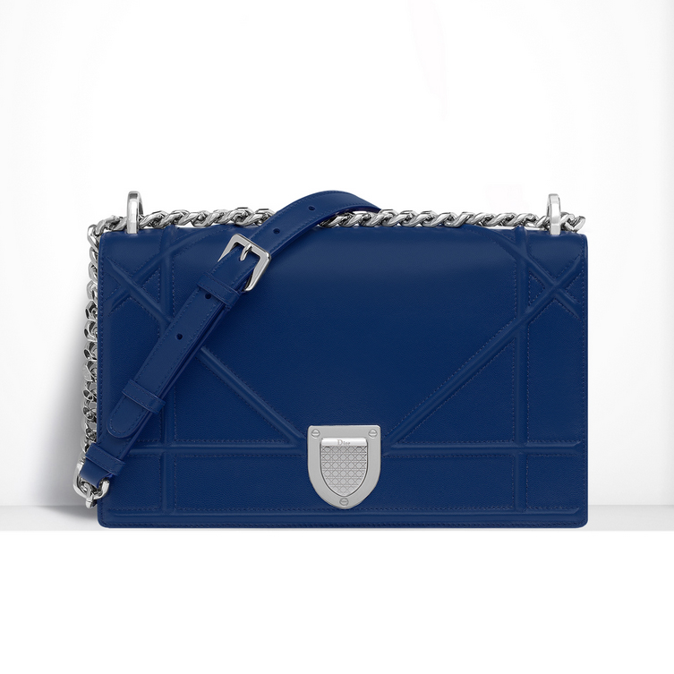 Fashionable and architectural, "Diorama" is the bag of the Spring-Summer 2015 show. This flap bag in blue lambskin is adorned with an oversized graphic cannage motif. Its crest-shaped clasp in silver-tone metal is the distinctive mark of the new Dior woman.