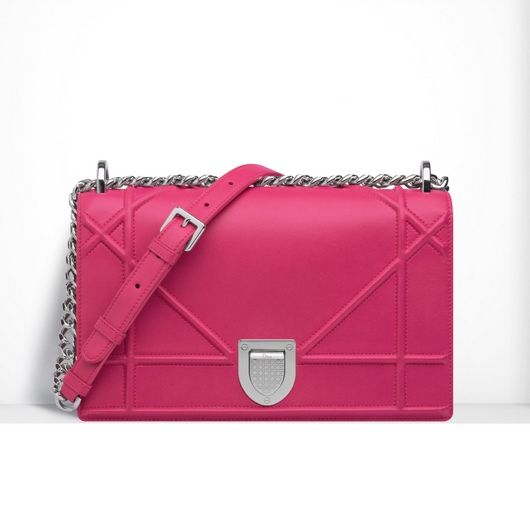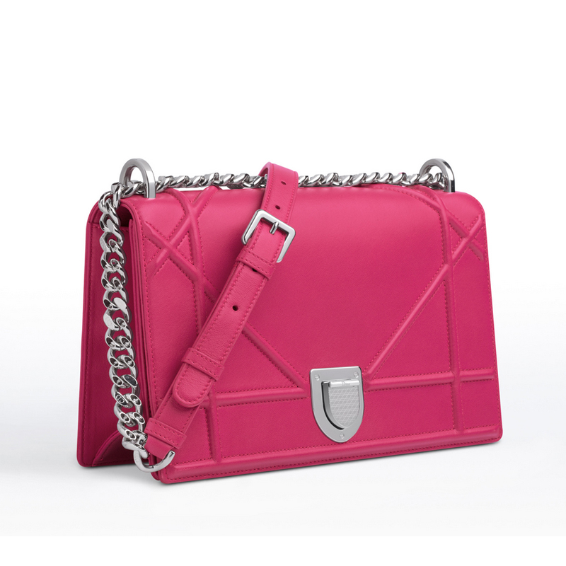 Fashionable and architectural, "Diorama" is the bag of the Spring-Summer 2015 show. This flap bag in fuchsia lambskin is adorned with an oversized graphic cannage motif. Its crest-shaped clasp in silver-tone metal is the distinctive mark of the new Dior woman.