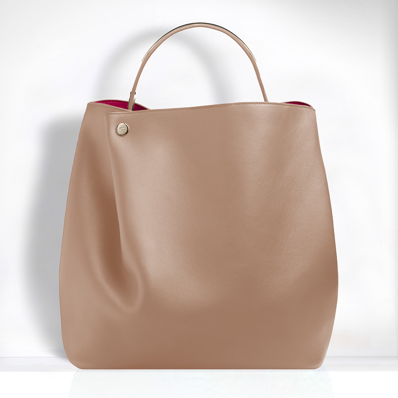 The "Diorific" line, revealed at the Spring-Summer 2014 show, expresses the creativity of Dior. This asymmetrical and modern bucket bag is inspired by the drapes from the Couture collection. The Nude colour, a new Dior classic, enhances the incredibly supple and sensual smooth pearlised calfskin. It offers the freedom of choice to carry it with the metal handle or the shoulder strap.