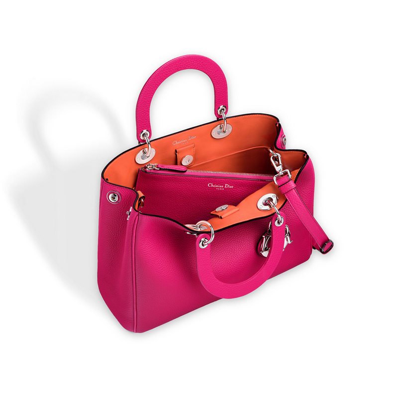 A true journey through the senses, the "Diorissimo" line embodies the craftsmanship of Dior. The bullcalf leather in a springtime Fraise colour, lined in Tangerine leather, makes this model unique.