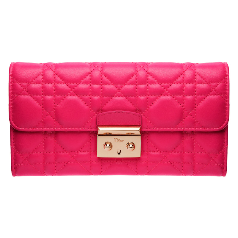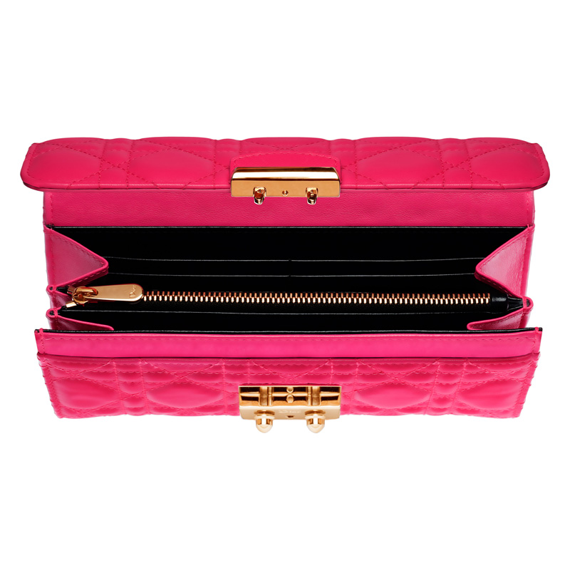 This long wallet in fuchsia quilted lambskin features distinctive 'Cannage' stitching. A pale gold-tone metal clasp with the 'Dior' logo adds elegance with a practical touch