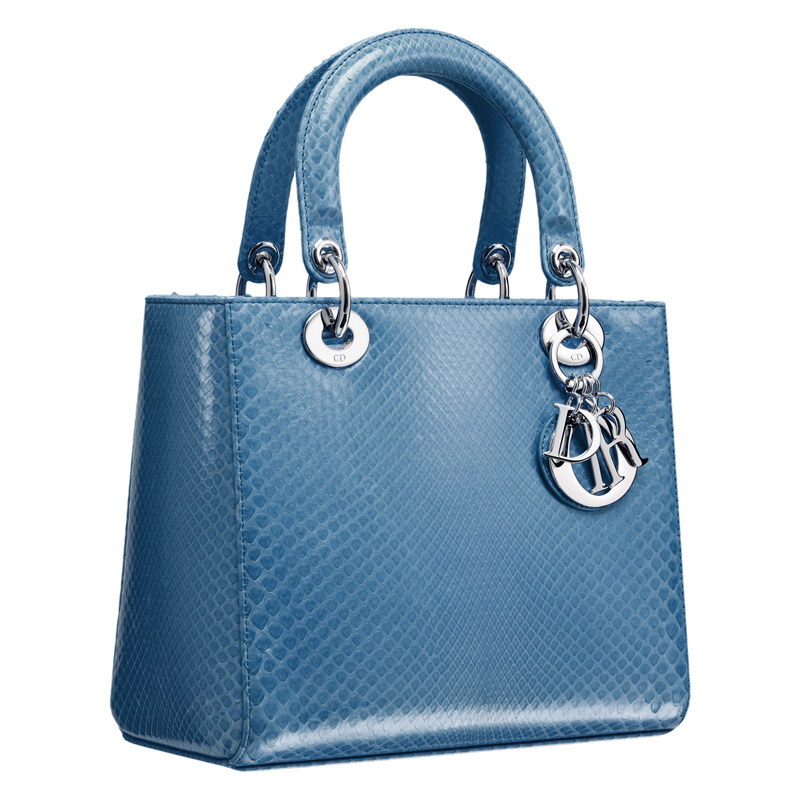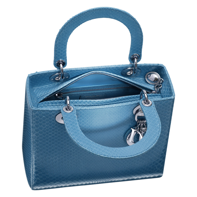 A timeless and unique work of art, the 'Lady Dior' bag is imbued with the Couture spirit of Dior. Meticulously crafted by hand, the bag in precious glossy mykonos blue python combines luxury with sophistication. Carry by hand, on the wrist or arm for unbeatable elegance